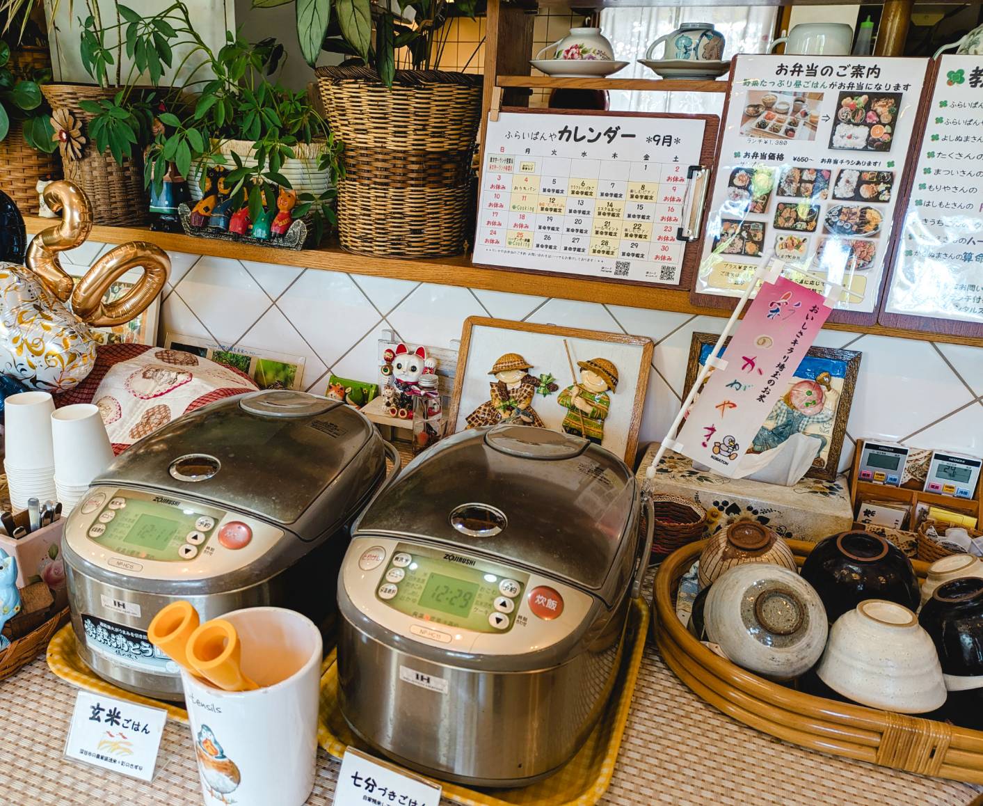 玄関を入っていただきましたら、手作り雑貨がお出迎え 毎日手作りのお惣菜が6種類盛られた「彩りプレート」、主菜はメニューよりお選びいただけます。 カウンターにある炊飯器から玄米、七分づきをお好きなお茶碗でお好きなだけ 日替わりの手作りデザートプレートもございます ペット連れのお客様や気持ちの良い風を感じてお食事されたいお客様は、ワンワンテラスをご利用ください。 |